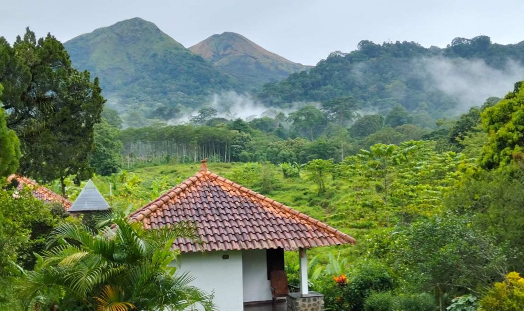 Ecolodge Seloliman dengan latar belakang pegunungan